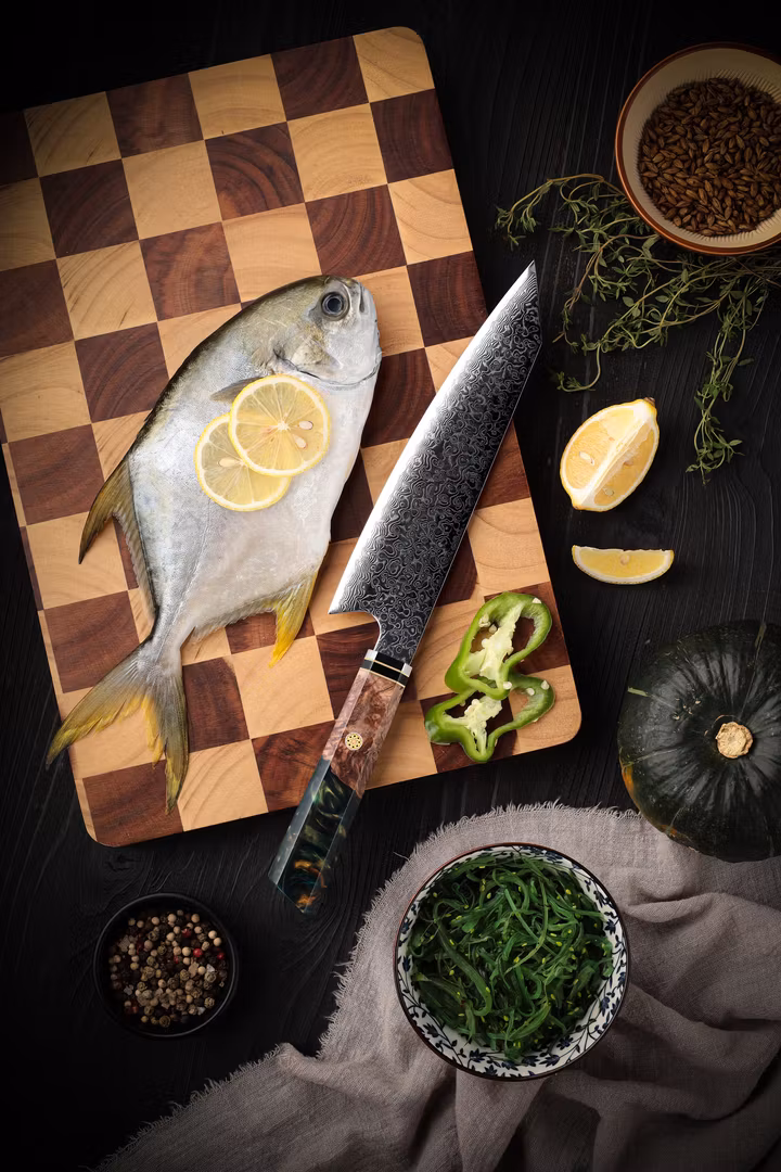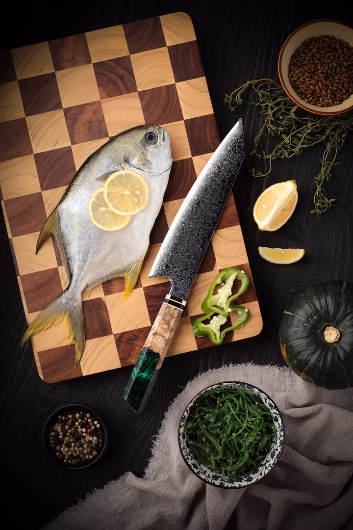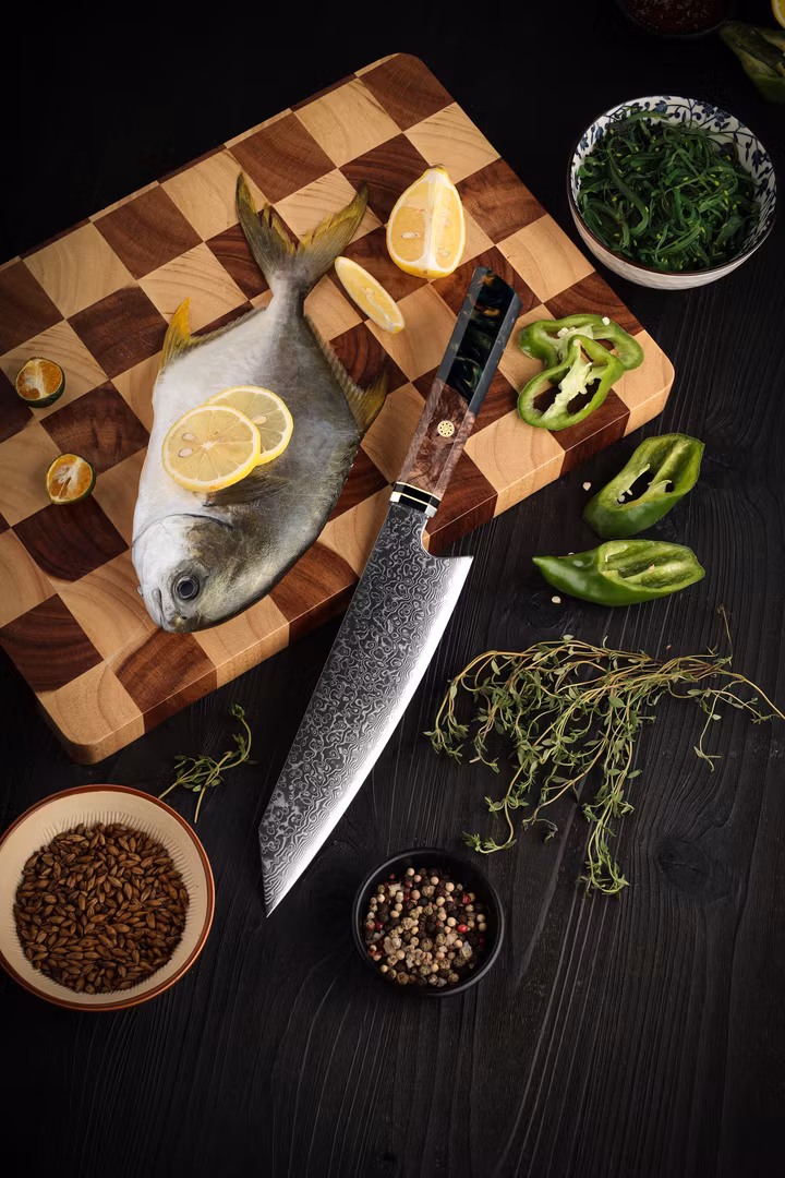 Handtaget är tillverkat av trä och epoxi, vilket ger både stil och ett bekvämt grepp. Denna kniv är idealisk för både professionella kockar och hemmakockar som söker högsta kvalitet och prestanda.