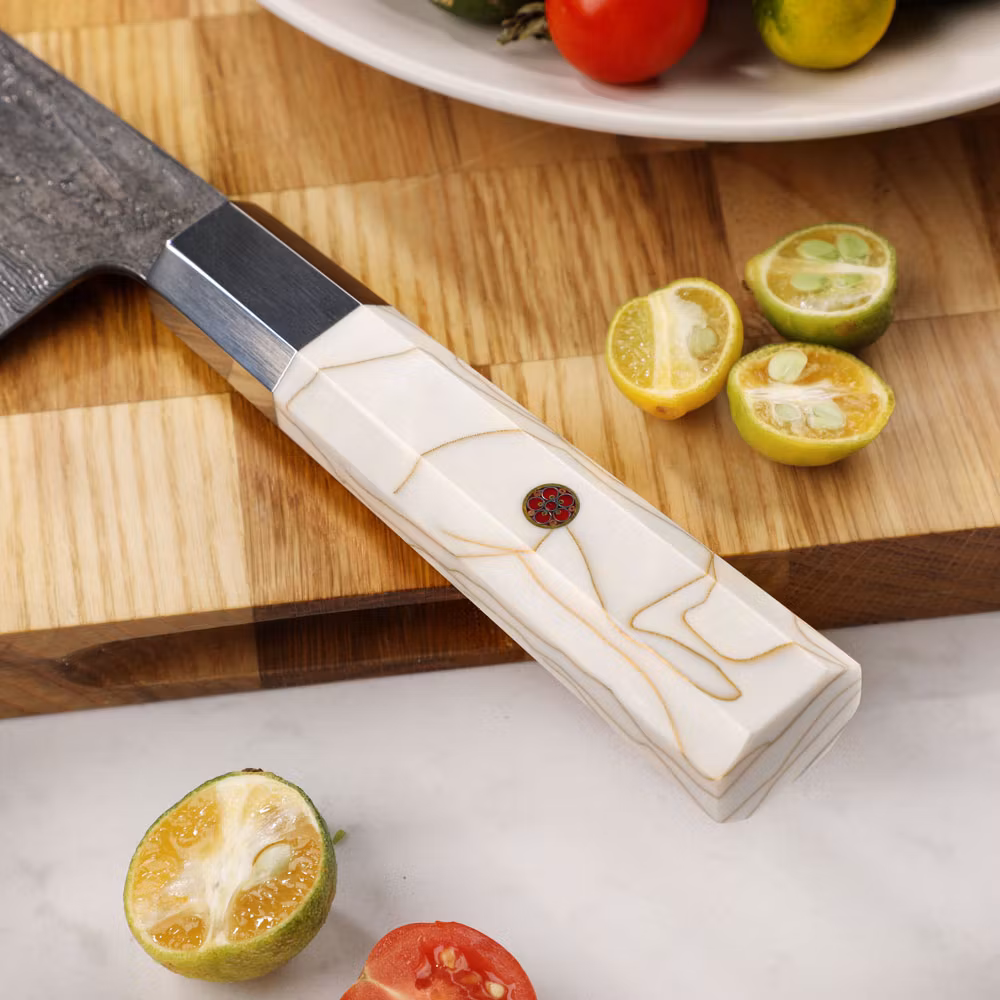 Handtaget är tillverkat av elegant vit resin med infällt kopparnät, vilket ger både stil och ett bekvämt grepp. Perfekt för både professionella kockar och hemmakockar som värdesätter högsta kvalitet och prestanda.