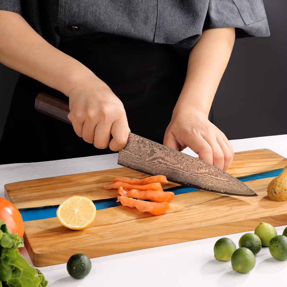 Handtaget är tillverkat av sandelträ, vilket ger både stil och ett bekvämt grepp. Perfekt för både professionella kockar och hemmakockar som värdesätter högsta kvalitet och prestanda.