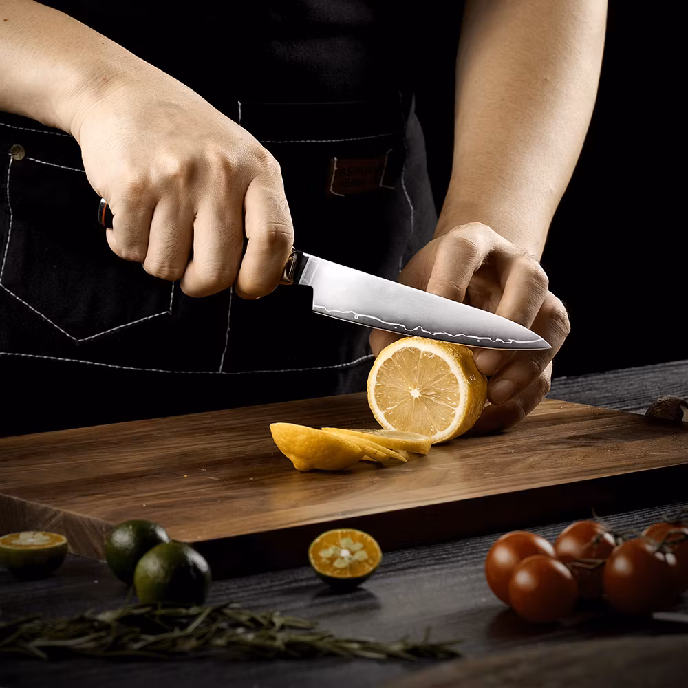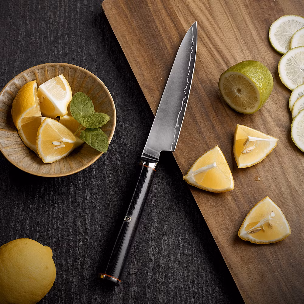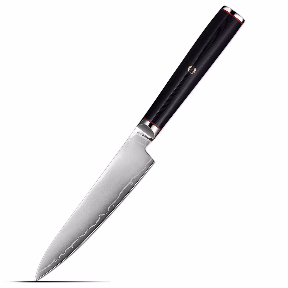 Handtaget är tillverkat av G10, vilket ger både stil och ett bekvämt grepp. Perfekt för professionella kockar och hemmakockar som söker högsta kvalitet och prestanda i sina specialverktyg.