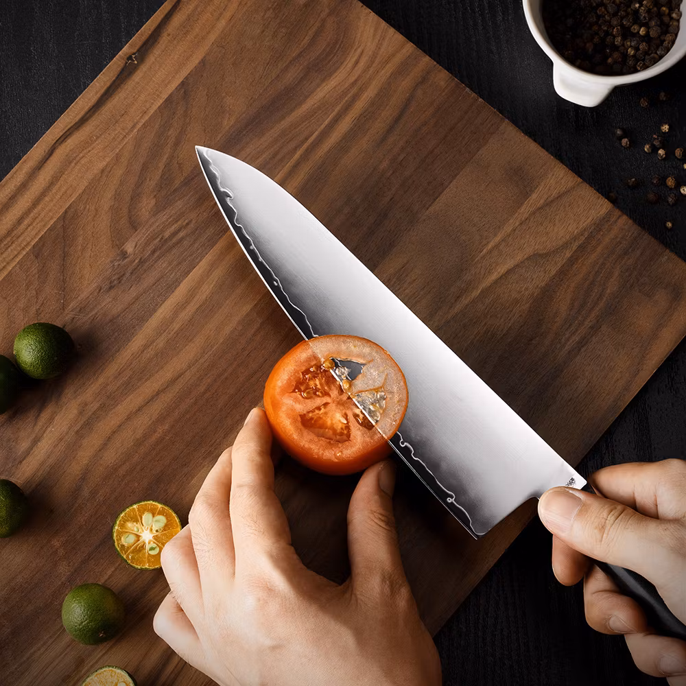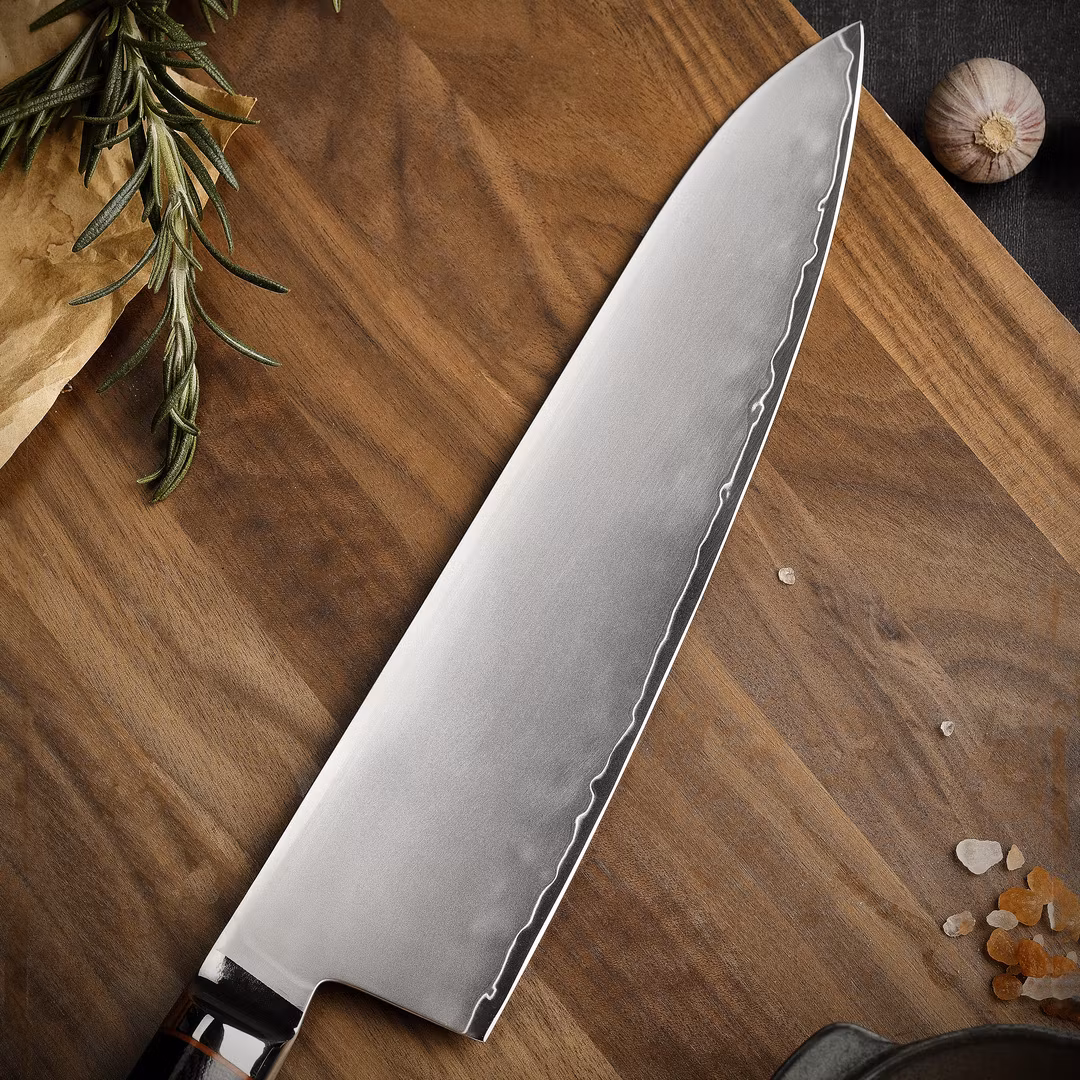 Upplev precision och skärpa med vår gyuto, designad för att möta kökets alla behov. Denna kniv är konstruerad med 3 lager stål och en kärna av VG10-stål, vilket