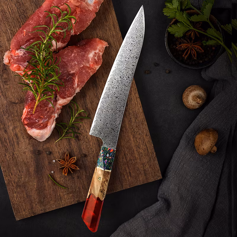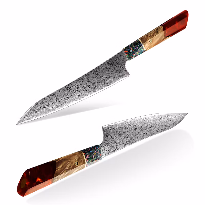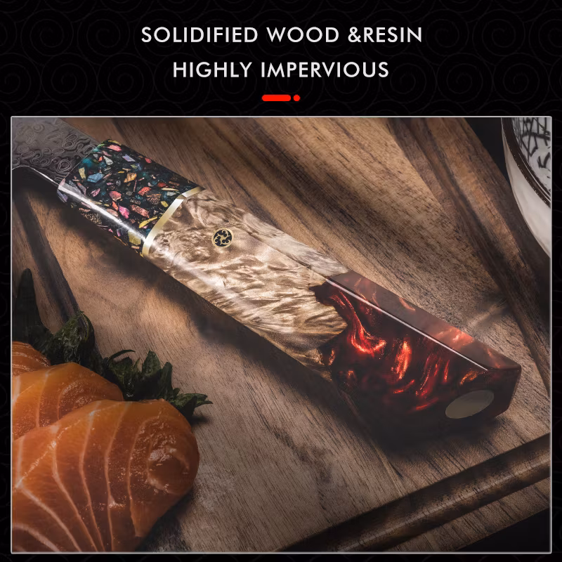 Handtaget är tillverkat av trä och epoxi, vilket ger både stil och ett bekvämt grepp. Denna kniv är idealisk för både professionella kockar och hemmakockar som söker högsta kvalitet och prestanda.