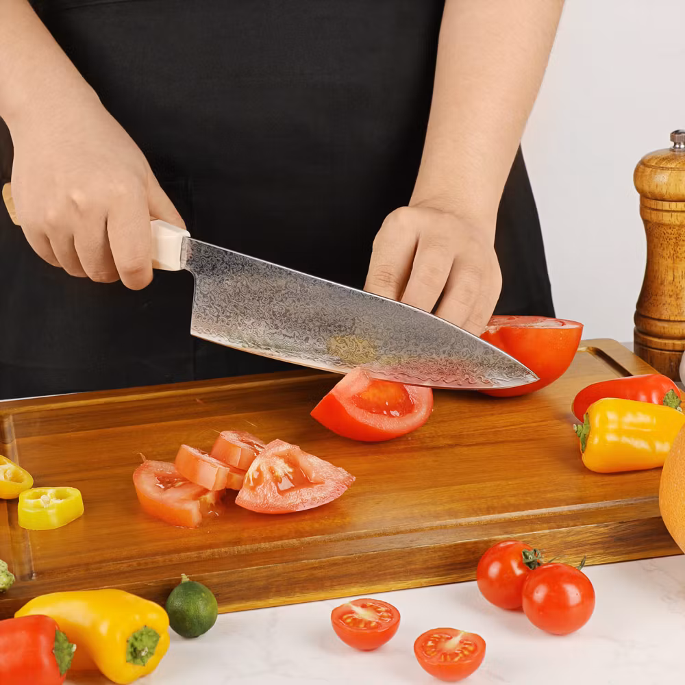 Gyuto med 67 Lagers Damascus och S35VN KärnaUpplev enastående mångsidighet och skärpa med vår gyuto, skapad för att uppfylla alla dina köksbehov. Med 67 lager d