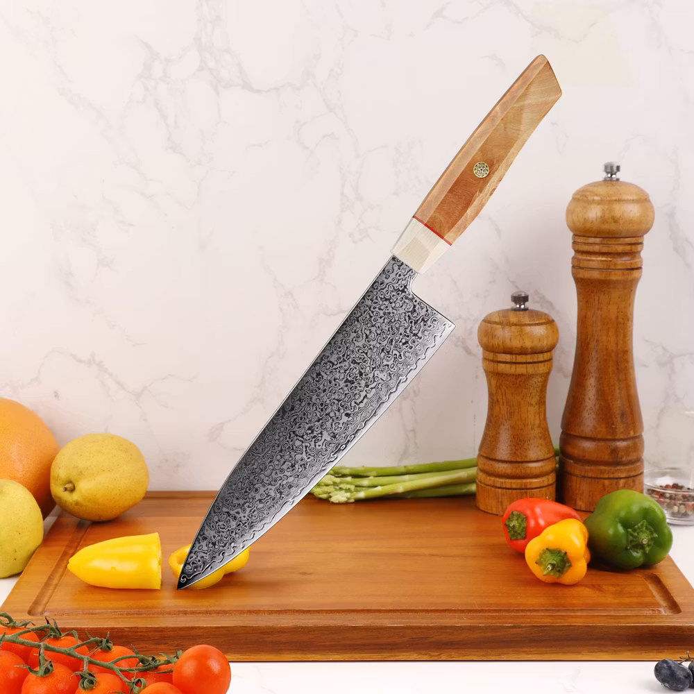 Upplev enastående mångsidighet och skärpa med vår gyuto, skapad för att uppfylla alla dina köksbehov. Med 67 lager damascusstål och en kärna av S35VN-stål, erbjuder denna kniv både hållbarhet och precision.
