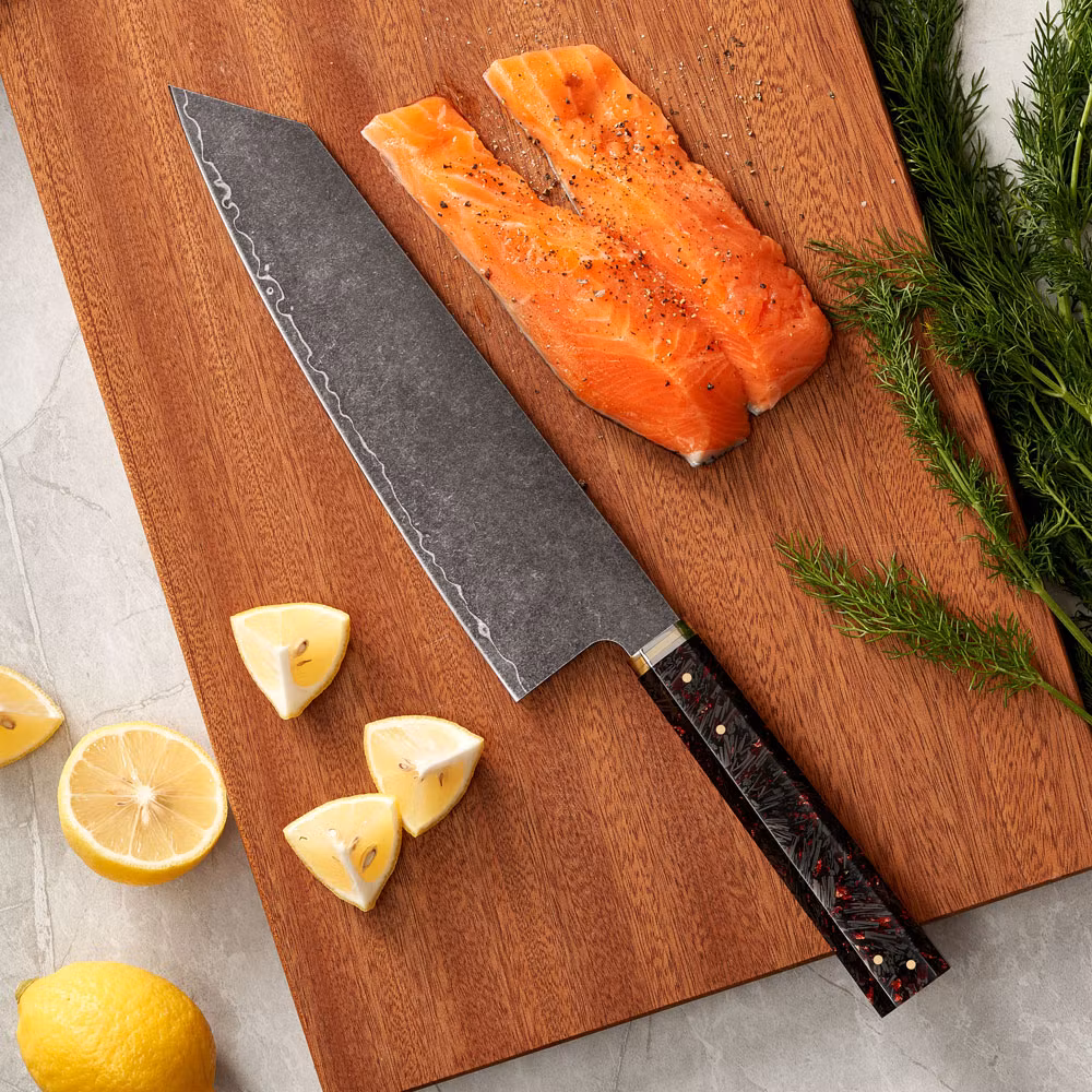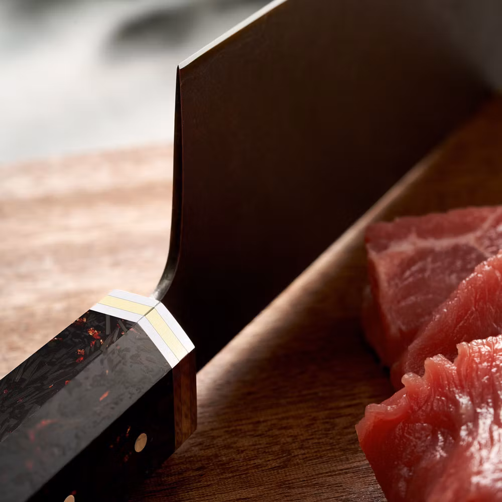 Handtaget är tillverkat av elegant kolfiber, vilket ger både stil och ett bekvämt grepp. Perfekt för både professionella kockar och hemmakockar som värdesätter högsta kvalitet och prestanda.