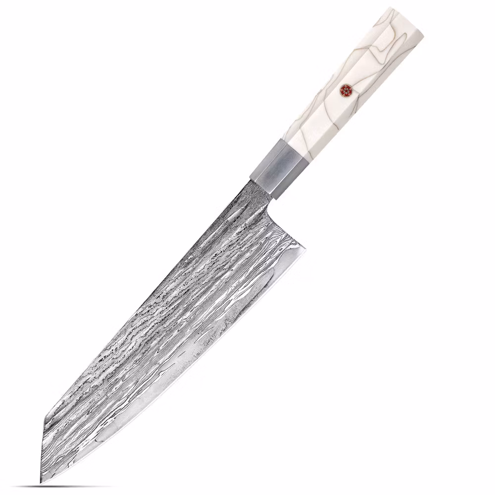 Upplev enastående mångsidighet och skärpa med vår Kiritsuke, skapad för att uppfylla alla dina köksbehov. Med 67 lager damascusstål och en kärna av VG10 stål, erbjuder denna kniv både hållbarhet och precision.