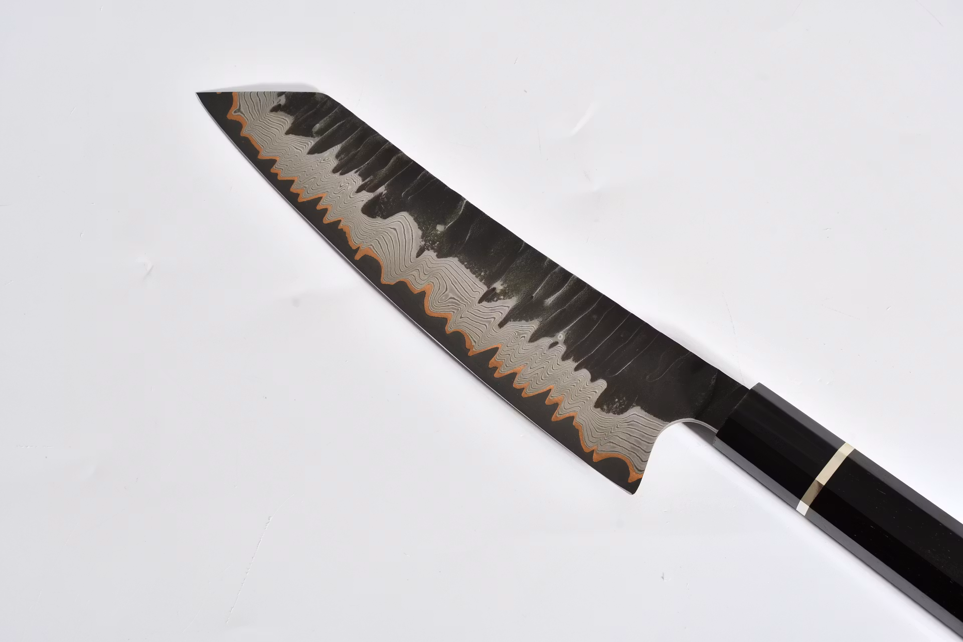 Det unika handtaget är en konstnärlig kombination av oxhorn, mässing och ebenholts, vilket ger både elegans och ett bekvämt grepp. Perfekt för kockar som söker det bästa inom knivteknologi