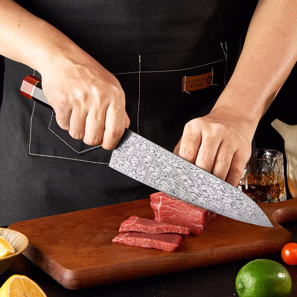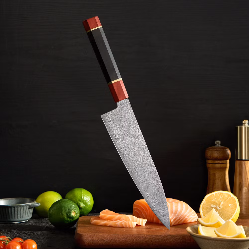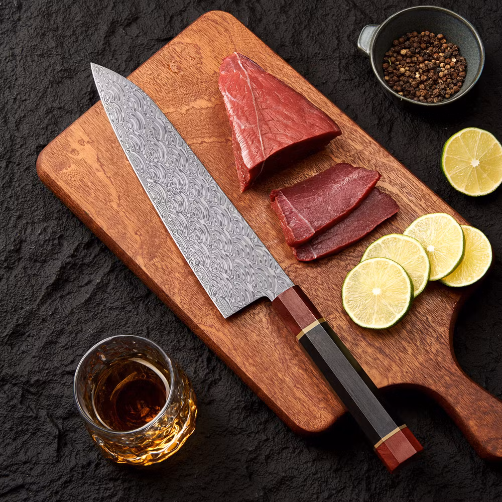 Gyuto med 110 lagers Damascus av 10Cr15CoMoV och 9cr18MoVUpptäck mångsidigheten och skärpan hos vår gyuto, perfekt för alla dina köksbehov. Med 110 lager av dam