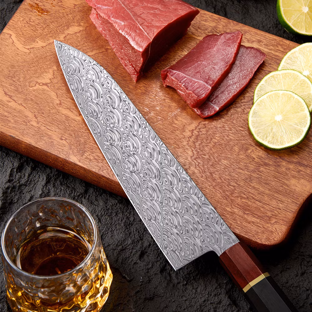 Gyuto med 110 lagers Damascus av 10Cr15CoMoV och 9cr18MoV