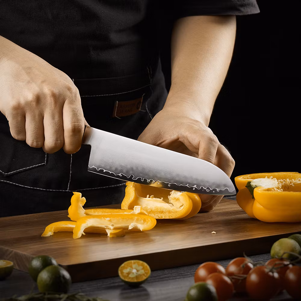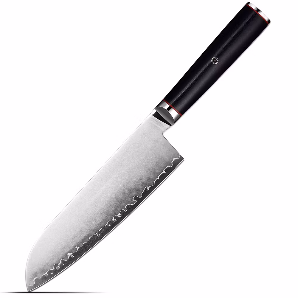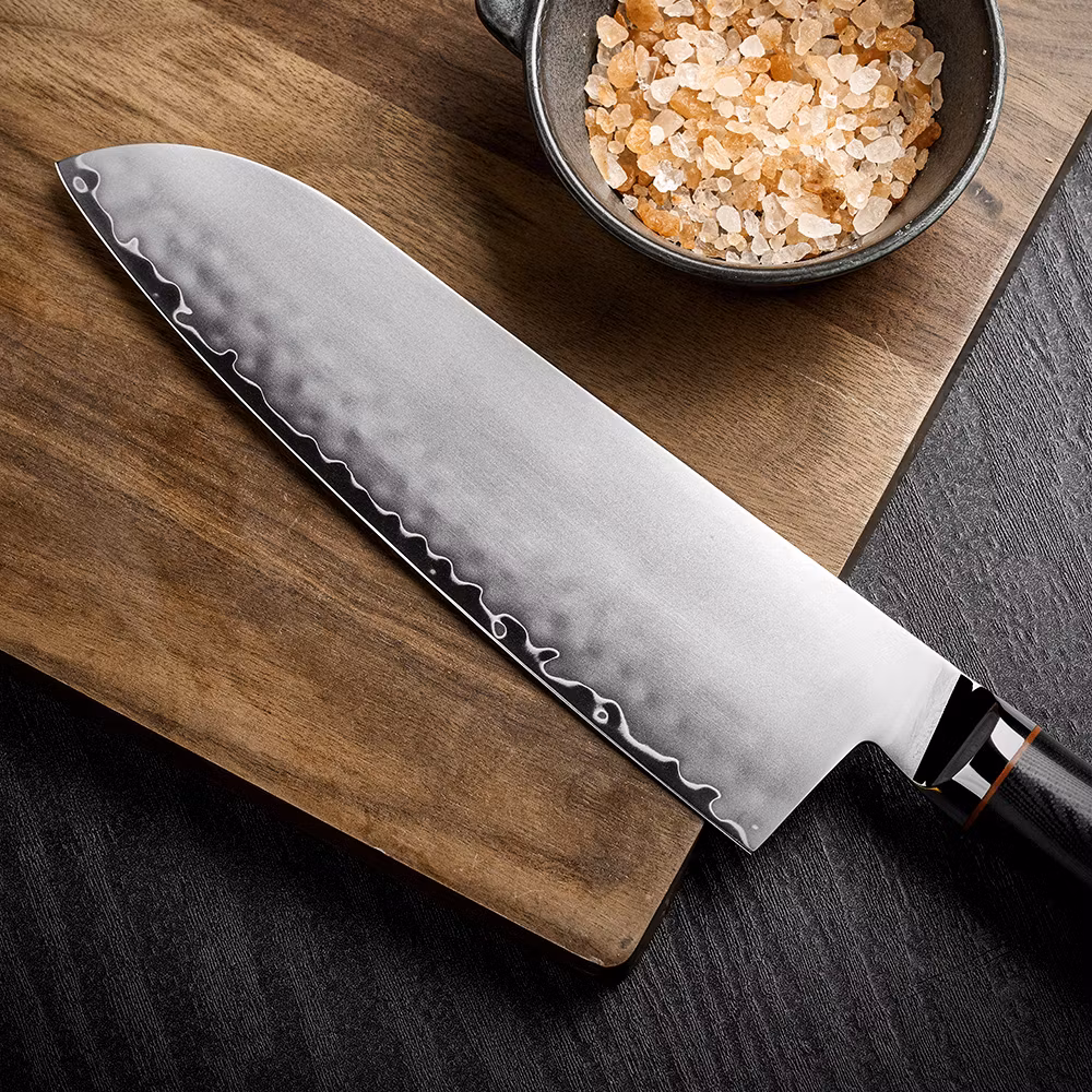 Upplev precision och skärpa med vår santoku, designad för att möta kökets alla behov. Denna kniv är konstruerad med 3 lager stål och en kärna av VG10-stål, vilket ger både hållbarhet och exakt prestanda. Perfekt för alla kökets uppgifter.