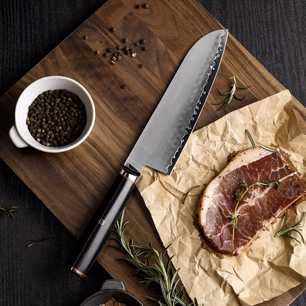 Upplev precision och skärpa med vår santoku, designad för att möta kökets alla behov. Denna kniv är konstruerad med 3 lager stål och en kärna av VG10-stål, vilk