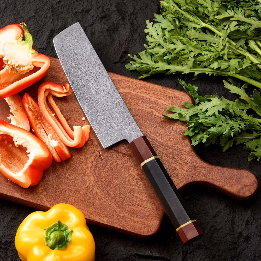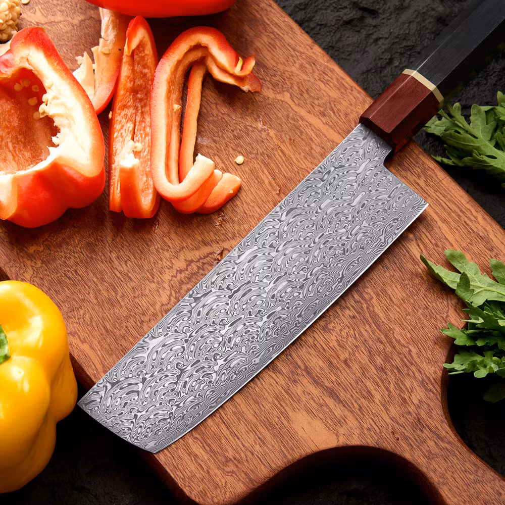 Upptäck mångsidigheten och skärpan hos vår nakiri, perfekt för att hacka, tärna och skiva grönsaker. Med 110 lager av damaskusstål, erbjuder denna kniv både hållbarhet och precision.