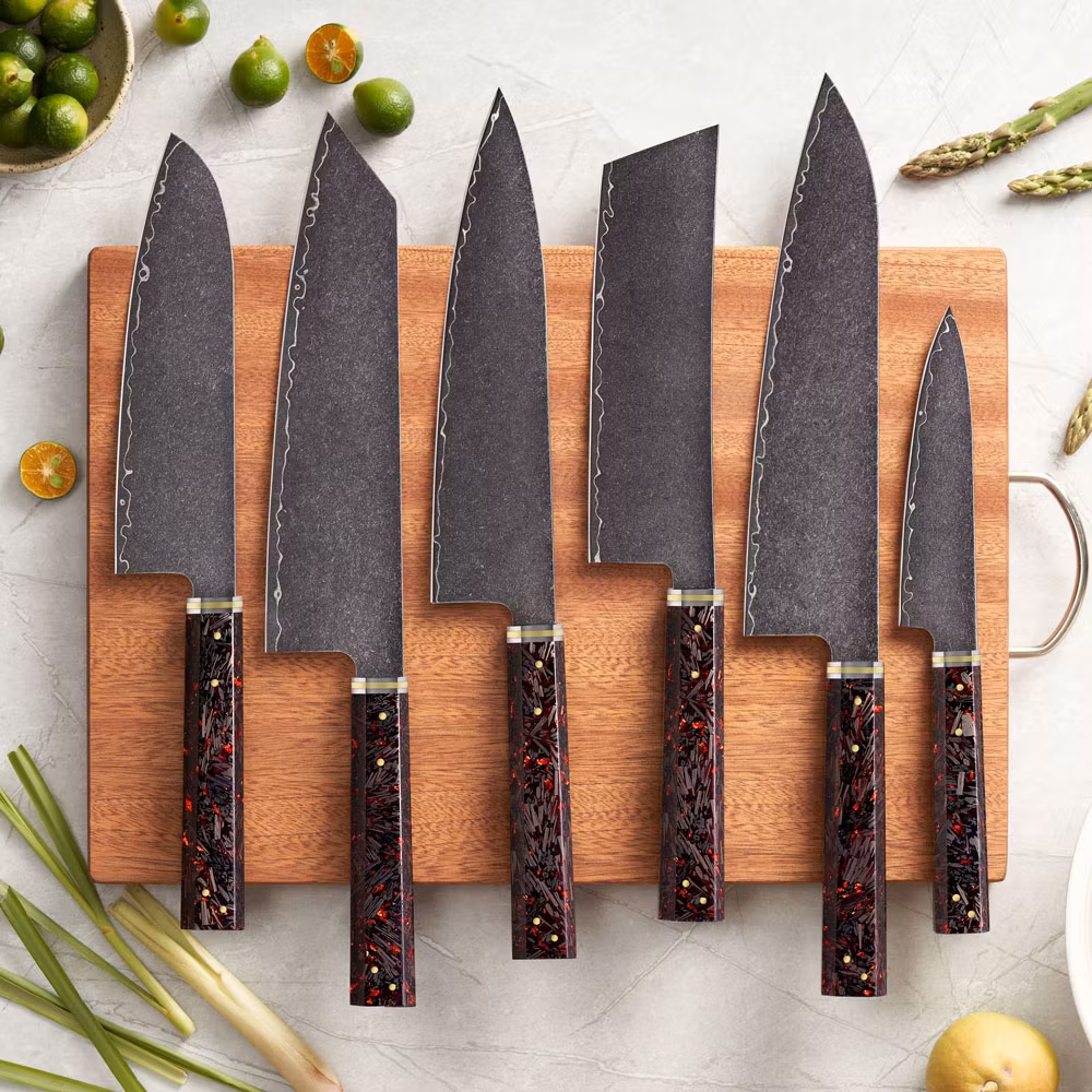 Handtaget är tillverkat av elegant kolfiber, vilket ger både stil och ett bekvämt grepp. Perfekt för både professionella kockar och hemmakockar som värdesätter högsta kvalitet och prestanda.