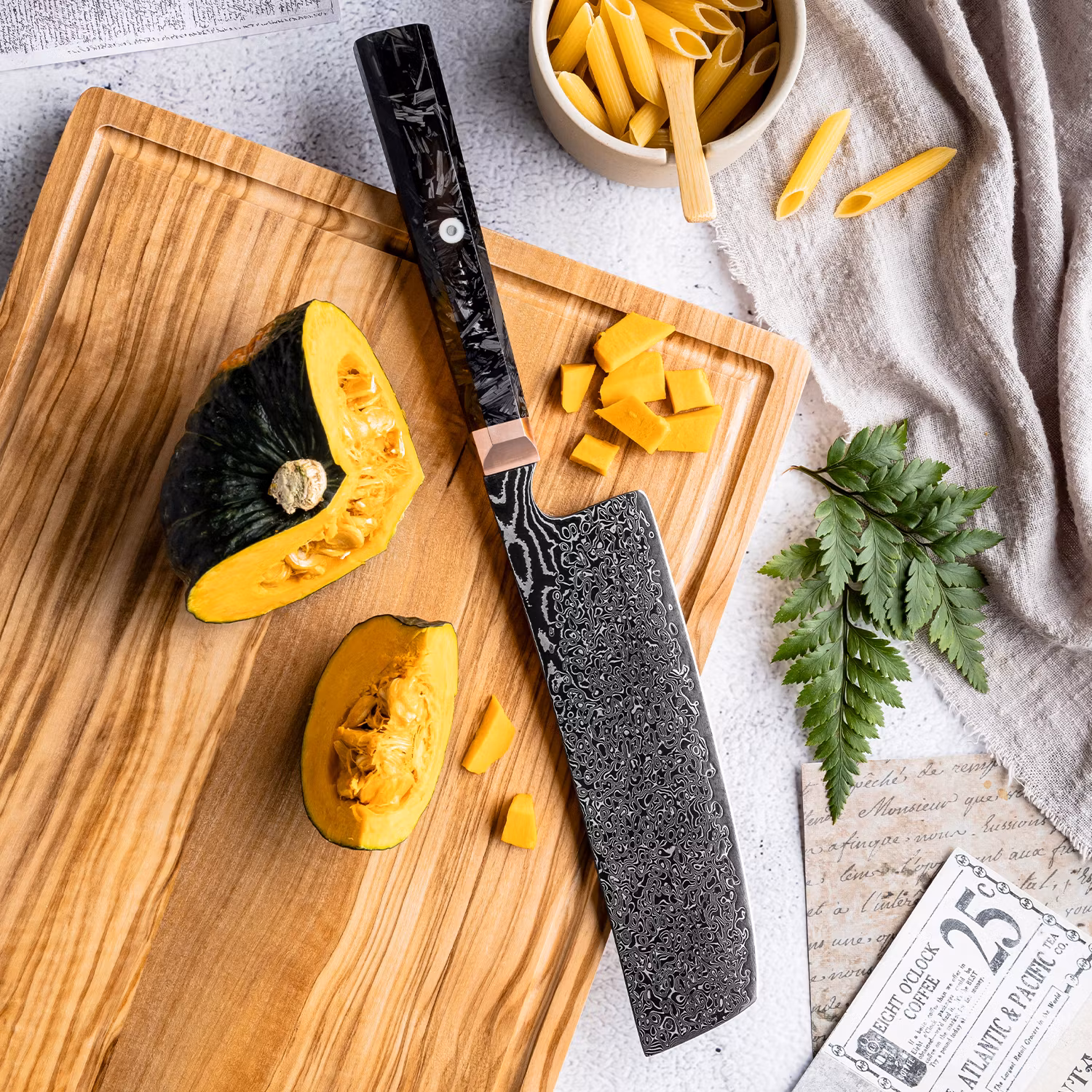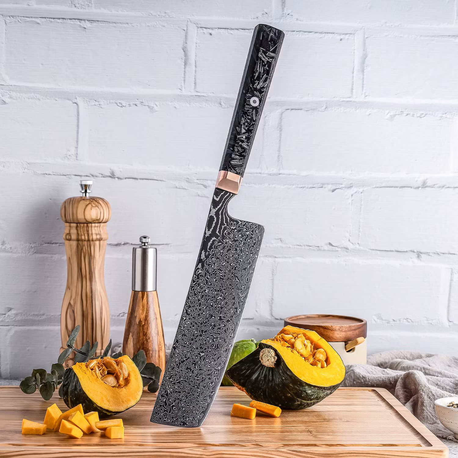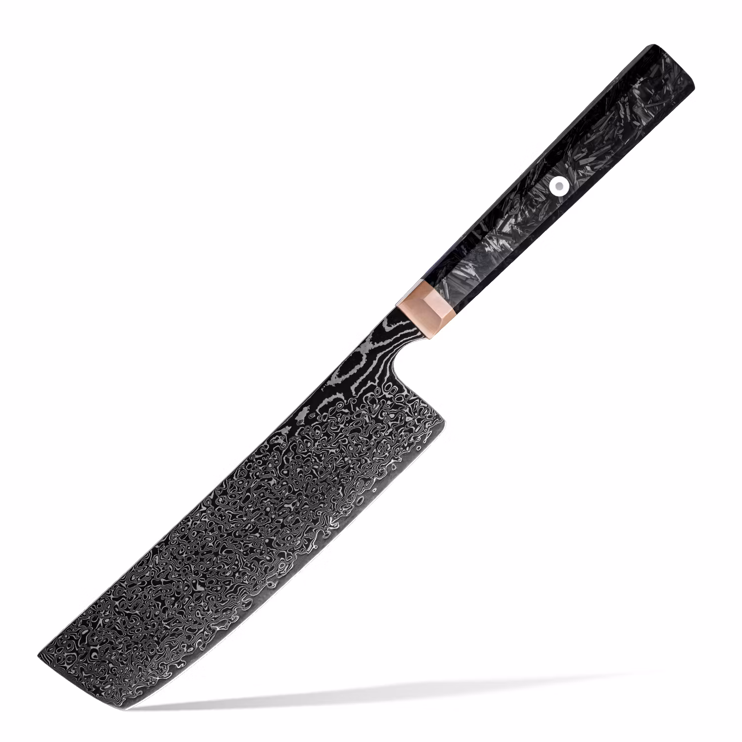 Handtaget är tillverkat av kolfiber och kopparbolster, vilket ger både stil och ett bekvämt grepp. Denna kniv är idealisk för både professionella kockar och hemmakockar som söker högsta kvalitet och prestanda.