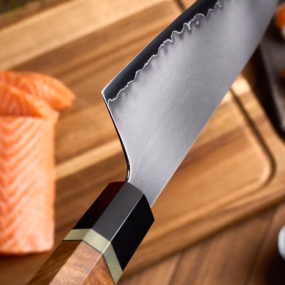 Handtaget är tillverkat av svart horn, koppar och burlträ. Sjukt fin kniv och ett bekvämt oktagonalt grepp. Denna kniv är idealisk för både professionella kockar och hemmakockar som söker högsta kvalitet och prestanda.