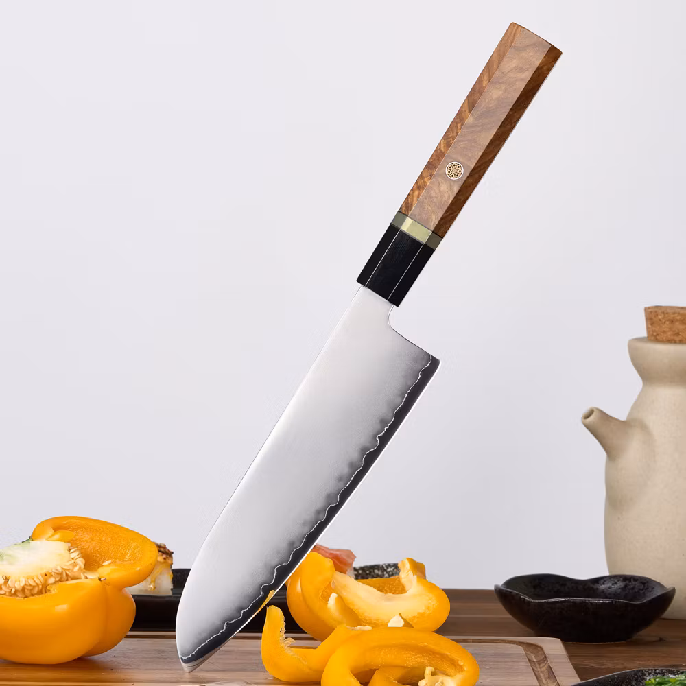 Santoku med 3 Lagers stål med en kärna av ZDP189 Upptäck mångsidigheten och skärpan hos vår Santoku, perfekt för alla dina köksbehov. Med 3 lager stål och