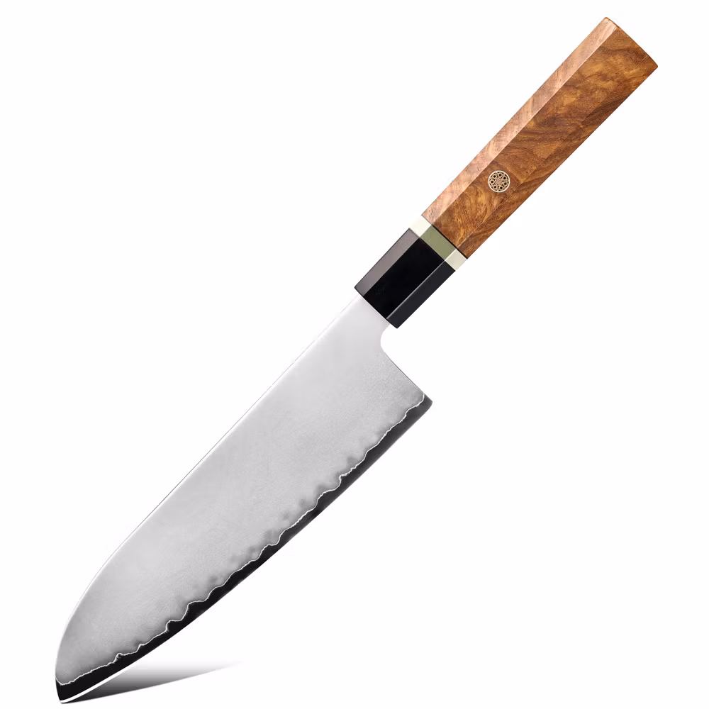 Upptäck mångsidigheten och skärpan hos vår Santoku, perfekt för alla dina köksbehov. Med 3 lager stål och en kärna av ZDP189. Ett av de hårdaste stålen som används inom knivindustrin.