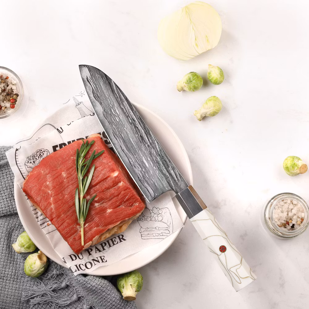 Upplev enastående mångsidighet och skärpa med vår santoku, skapad för att uppfylla alla dina köksbehov. Med 67 lager damascusstål och en kärna av VG10 stål, erbjuder denna kniv både hållbarhet och precision.