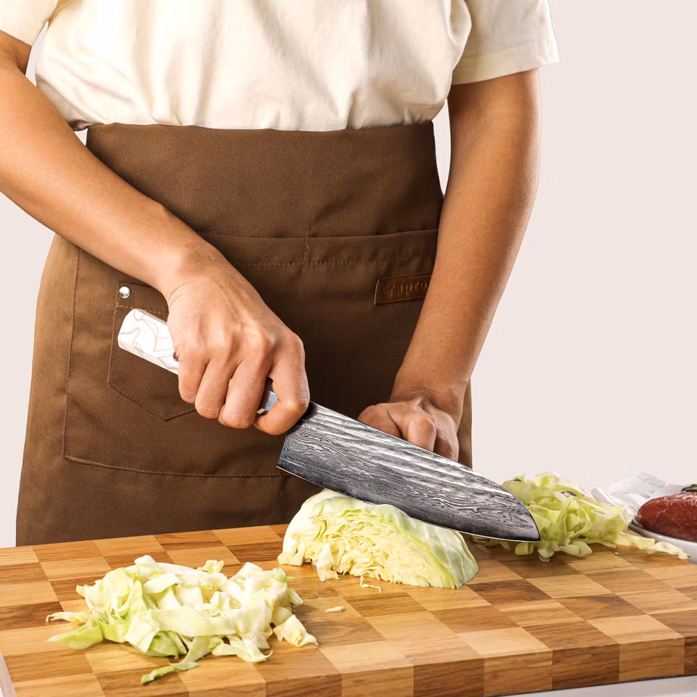 Santoku med 67 Lagers Damascus och VG10 KärnaUpplev enastående mångsidighet och skärpa med vår santoku, skapad för att uppfylla alla dina köksbehov. Med 67 lage